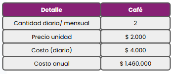 Piense en que todos los días se toma dos tintos en la cafetería del barrio y que cada uno cuesta $2.000. Diario serían $4.000 si lo multiplicamos por 365 días nos daría $1.460.000.